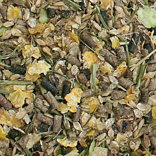 Gerstenflocken (aufgeschlossen), Haferflockenpellets, Luzerne, Maisflocken (aufgeschlossen), Weizengrieß, Leinsamenöl, Weizenstärke, Haferflocken (aufgeschlossen), Vitamin- und Mineralstoff-Mischung, Leinsamen (extrudiert), Erbsenflocken (aufgeschlossen), grobe Luzerne, Johannisbrot, Apfeltrester und Yea Sacc.